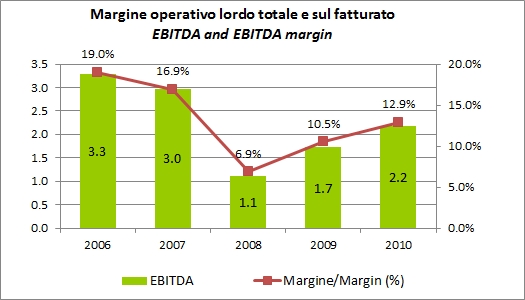 • Il MOL sale da 1.7 a 2.2 milioni, +26%, margine del 13% (10.5% nel 2009). Utile operativo a 0.8m con ammortamenti in leggero calo.