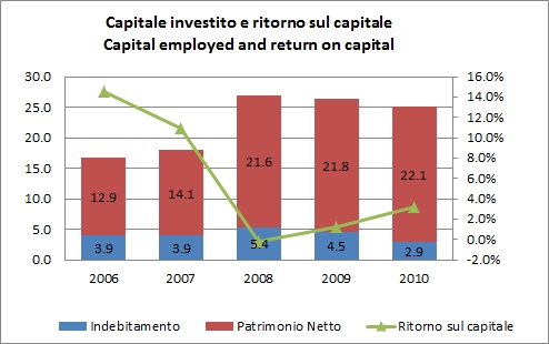 • La struttura finanziaria migliora, con il debito in discesa da 4.5 a 2.9 milioni di euro. I parametri finanziari sono tornati quelli degli anni buoni con un debito/MOL di 1.3x (2.6x nel 2009).