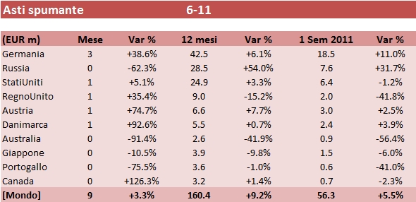 • Ex Russia, il segmento dell’Asti e’ cresciuto del 3% nel corso degli ultimi 12 mesi. Se la crescita resta la medesima e ipotizzando un calo del 30% dell’export russo, l’Asti spumante perderebbe circa il 3% in valore di esportazioni di qui a giugno 2012.