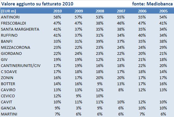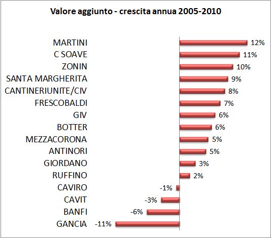 Se prendiamo il valore aggiunto, cioe’ il fatturato dedotti i costi esterni (acquisti), il dato e’ in crescita nel 2010 di circa il 10%. Tra le aziende piu’ importanti, Santa Margherita ha realizzato l’incremento piu’ importante (+18%), mentre Antinori, Frescobaldi e GIV sono cresciuti del 10-12%.