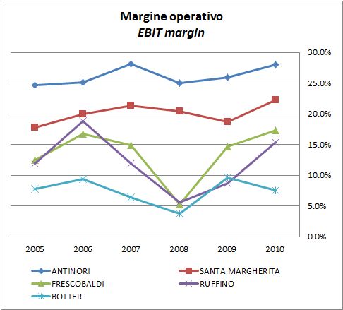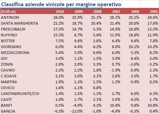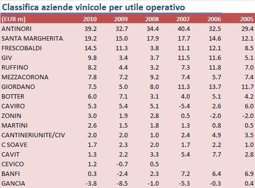 Dal punto di vista degli utili, Antinori si conferma il leader italiano, seguito da Santa Margherita, Frescobaldi, GIV e Ruffino a seconda dei parametri presi in considerazione.