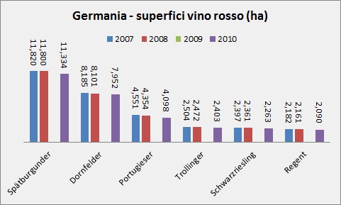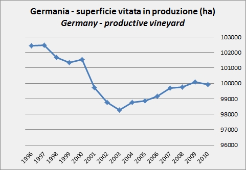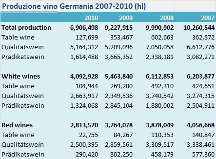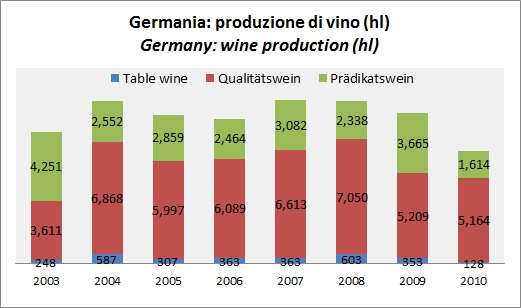 • Nel 2010 la Germania ha subito un forte calo della produzione di vino. Sono stati prodotti poco meno di 7m/hl, cioe’ il 25% in meno rispetto all’anno precedente e alla media storica, che sta tra 9 e 10 milioni di ettolitri.