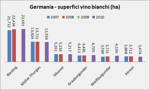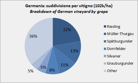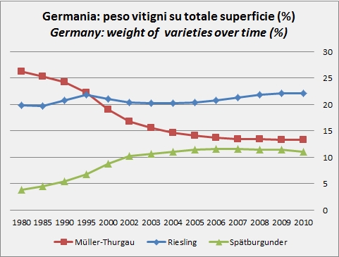 • Continua la riqualificazione del vigneto tedesco: il Riesling e’ stabile a circa il 22% del vigneto totale, continua a perdere terreno il Muller-Thurgau, ormai al 13.3% (era piu’ del Riesling nel lontano 1995), e il Sylvaner. Dato che la penetrazione dei vitigni bianchi non cambia (anzi, sale leggermente), a guadagnare terreno sono il Pinot Grigio e il Pinot Bianco, intorno all’8.6% del vigneto totale. Ancora molto piccolo, ma sta guadagnando terreno anche lo Chardonnay, oggi all’1.3% del vigneto tedesco.