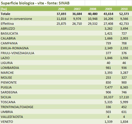 • Non molto diverso e’ il discorso della penetrazione della superficie biologica rispetto a quella totale. Quindi quanta della vigna e’ stata convertita al biologico. Anche in questo caso, se scorrete i dati dell’ultima tabella (dove si confrontano i dati SINAB 2010 con i recenti dati del censimento ISTAT) potete notare come in nessuna regione del Nord Italia si superi il livello del 5% di superficie bio sul totale vitato. Bisogna arrivare alla Toscana per trovare un livello dell’11%, e alle Marche per trovare una delle penetrazioni piu’ alte, il 21%. A dire la verita’ la classifica la guida la Calabria con il 22% della superficie totale. La Sicilia, che come dicevamo e’ la regione con il maggior numero di ettari bio, ha convertito a biologico circa il 15% della superficie totale.