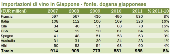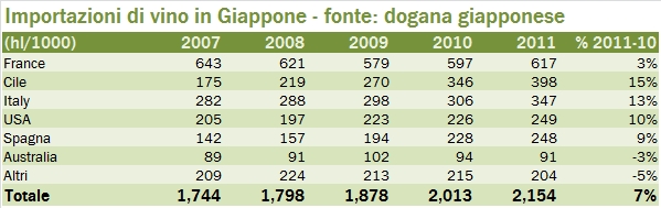 Giappone: importazioni di vino e quote di mercato – aggiornamento 2011