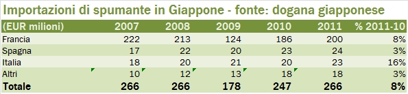 • L’Italia ha avuto un anno eccellente, con un +10% in yen e un +16% in Euro a 126 milioni e mantiene saldamente il secondo posto nel mercato con il 13% circa del valore e il 16% del volume. Sui volumi siamo in realtà preceduti anche dal Cile, che ha il 16% del mercato ed è cresciuto leggermente più di noi (+15% rispetto a +13%) anche nel 2011.