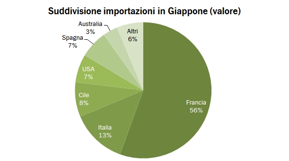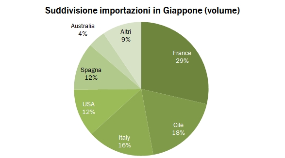 • Proprio il Cile è il terzo prodotto per fatturato in Giappone. Nel giro di 4 anni sono passati dal 4% all’8% del mercato e nel 2011 sono cresciuti del 16%. Sono ancora molto lontani dall’Italia ma occupano saldamente il terzo posto.