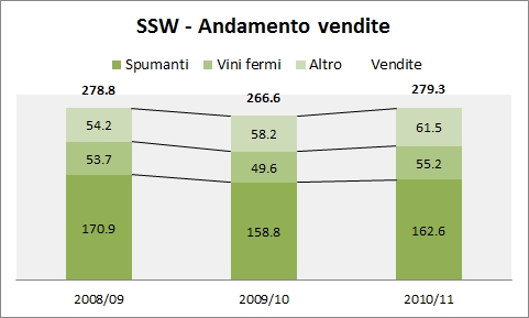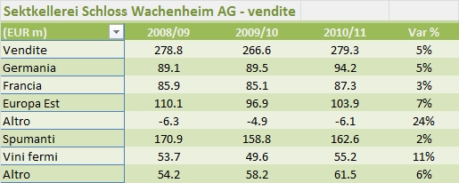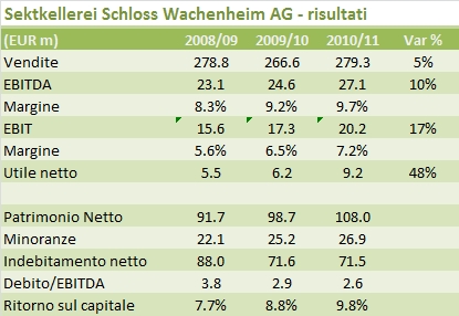 Avevo promesso di tenervi informato su Sektkellerei Schloss Wachenheim (SSW) ed eccoci qui. L’azienda di spumantistica tedesca (quotata in borsa, vale 62 milioni di euro in capitalizzazione) ha fatto buoni progressi sulla strada della ristrutturazione: a fronte di vendite in crescita del 5% nell’anno fiscale 2010-11, l’utile operativo e’ cresciuto del 17% e l’utile netto e’ aumentato del 50%, consentendo un ritorno al dividendo. E tale miglioramento e’ proseguito anche nel primo semestre dell’anno fiscale 2011-12.