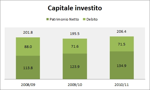 - L’indebitamento netto e’ rimasto stabile a 71 milioni, il che implica un capitale investito di 206 milioni di euro, con un ritorno sul capitale prima delle tasse del 10% circa, rispetto al 9% dello scorso anno.