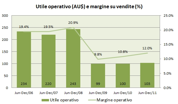 - Le vendite calano del 7% a 858 milioni nel primo semestre 2011-12. Di questo calo, circa il 5% e’ dovuto ai cambi. Quindi le vendite a pari cambi sarebbero scese del 2.6%. A sua volta, questo 2.6% e’ fatto di una riduzione del 6% delle casse vendute (da 18 a 16.9 milioni) e di un incremento del 3.7% del prezzo medio per cassa (da 49 a 51 dollari australiani).