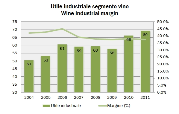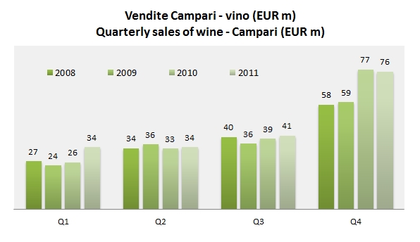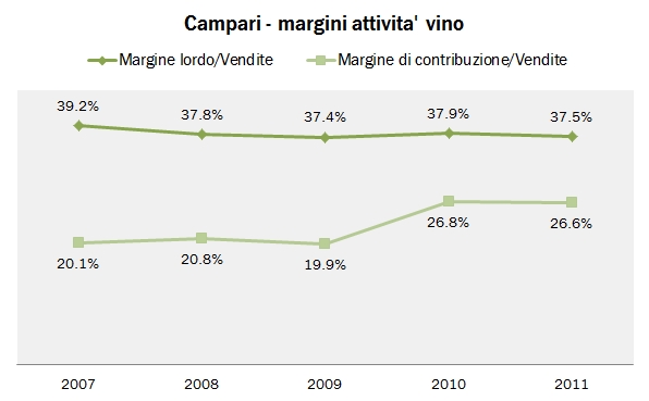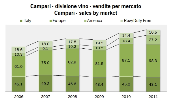Campari ha riportato un 2011 in decelerazione nel segmento vino, appesantito dalla difficile situazione di mercato in Italia ed Europa e una decelerazione nel ritmo di crescita di quasi tutte le linee di prodotto salvo il Vermouth Cinzano. Tutto sommato l’anno si è mantenuto in terreno positivo, grazie ai risultati del primo semestre: alla fine dell’anno le vendite sono cresciute del 6%, di cui il 5.6% in termini organici, e l’utile operativo prima dei costi generali è cresciuto del 5.4% (sempre prima di cambi e acquisizioni). La strategia di crescere nel segmento della distribuzione continua: secondo il bilancio 2011, i brand di terzi distribuiti hanno rappresentato il 4% delle vendite della divisione.
