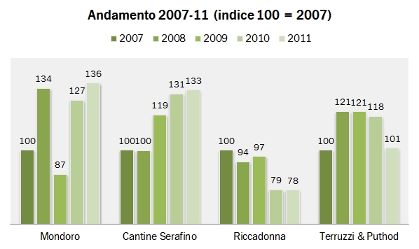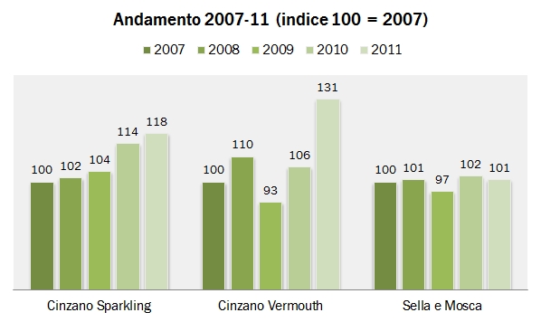 - Veniamo ai marchi. L’unico brand in forte crescita è Cinzano Vermouth, che è cresciuto del 24% in termini organici, mentre Cinzano spumanti ha mantenuto un passo del 3-4%. Se confrontiamo i dati su un periodo sufficientemente lungo (2007-2011) e usiamo un indice 100 e escludiamo i cambi, il Vermouth ha avuto un passo decisamente diverso dallo spumante, essenzialmente per posizionamento geografico.