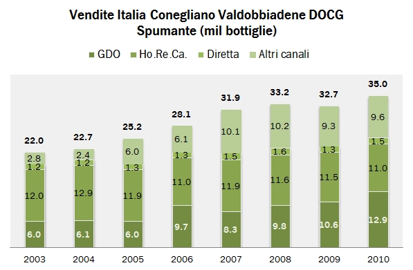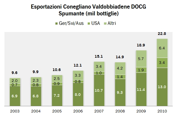- Secondo il rapporto si sono prodotte circa 58 milioni di bottiglie di Conegliano Valdobbiadene spumante e 8 milioni di varietà frizzante nel 2010. La crescita dello spumante è stata del 12%, mentre se calcolata su un orizzonte di 7 anni, quello dello studio, si arriva a un +9% annuo (dato molto ragguardevole). Da questo momento in avanti tutti i commenti riguardano esclusivamente la varietà spumante.