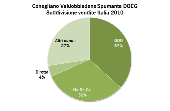 - Le vendite in Italia sono state in forte crescita fino al 2008. Nel 2010 sono state vendute circa 35 milioni di bottiglie, con una crescita del 7%, dunque inferiore al +12% totale, ma comunque sempre in prevalenza (60%) rispetto alle esportazioni. Le vendite sono sempre più guidate dalla grande distribuzione, che rappresenta circa il 37% del totale volume venduto, contro un peso del 27% del 2003. Il dato relativo all’Ho.Re.Ca. mi sembra sporcato dall’introduzione dei grossisti nel campione a partire dal 2006, ma comunque mostra la difficoltà di questo segmento che è sempre calato negli ultimi anni.