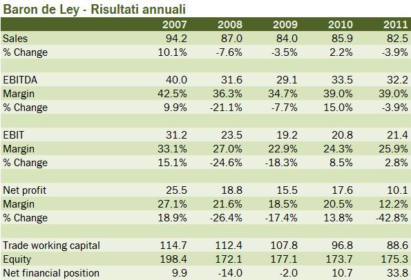 Baron de Ley non è stato nel 2011 immune dalla crisi spagnola: le vendite nel mercato domestico sono scese per il quarto anno consecutivo, e non di poco. Anche gli ultimi dati alla fine del primo semestre mostrano un ulteriore, seppur meno pronunciato decremento. I risultati che analizziamo oggi però ci parlano di altre cose, e cioè del grande sforzo dell’azienda di ridurre il capitale circolante e gli investimenti per migliorare il profilo di generazione di cassa. L’utile è stato molto più basso dell’anno scorso a causa degli eventi straordinari, mentre l’utile operativo è leggermente cresciuto. Nel primo semestre i margini hanno mostrato un ulteriore incremento. Vediamo i punti chiave: