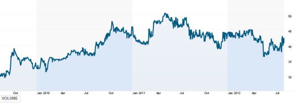 - Vi ho postato, in blu, il grafico del prezzo del titolo (fonte: Reuters). Come vedete la quotazione di Baron de Ley è stata particolarmente stabile nel corso degli ultimi 2 anni: si tratta indubbiamente di una ottima prestazione, soprattutto se confrontata al mercato borsistico nel quale il titolo tratta: quello spagnolo.