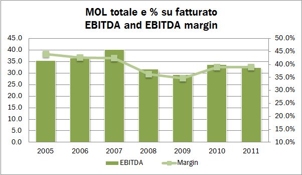 - Il margine operativo lordo nel 2011 è sceso del 4%, quindi con un margine percentuale stabile su un livello molto elevato del 39%. Con ammortamenti in calo, l’utile operativo sale del 3% a 21 milioni. Come abbiamo accennato all’inizio, un accantonamento tra gli oneri finanziari e una tassazione molto elevata hanno comportato il calo dell’utile netto da 17 a 10 milioni.