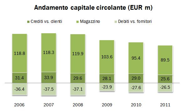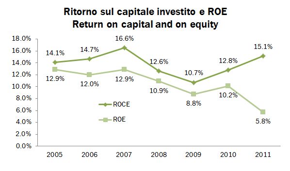- Il ritorno sul capitale sale al 15%, dal 13% dello scorso anno, soprattutto grazie alla riduzione del capitale investito da 163 milioni a 141 milioni di euro.