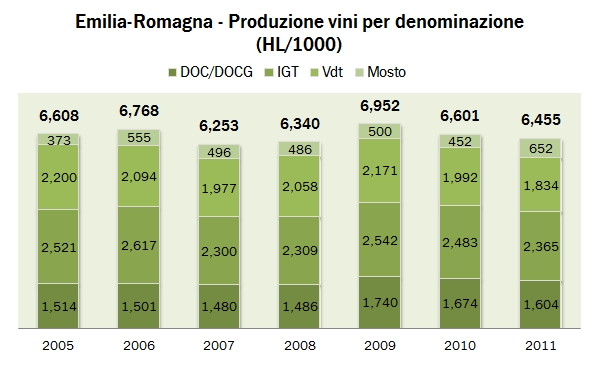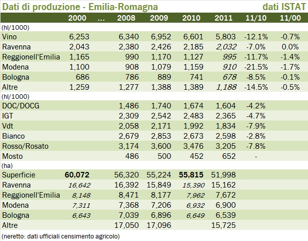 La rassegna dei dati ISTAT passa oggi per l’Emilia Romagna, dove il quadro produttivo è sostanzialmente stabile (-2%) contro un calo della produzione italiana del 9% circa nel 2011. Il quadro qualitativo è però in peggioramento, con una riduzione della produzione di vino a fronte di un balzo della produzione di mosto (+44%). Un dato particolarmente interessante è quello relativo alle superfici vitate, che sembrano essere rilevate da ISTAT in modo corretto (nel senso che i dati del censimento corrispondono con quelli di agriISTAT): la regione è passata da 60mila a 55mila ettari di vigneto in 10 anni, nel 2010, per perderne quasi altri 4mila soltanto nel 2011. Se così è si dovranno vedere degli effetti sulla produzione dei prossimi anni. Vediamo i numeri.