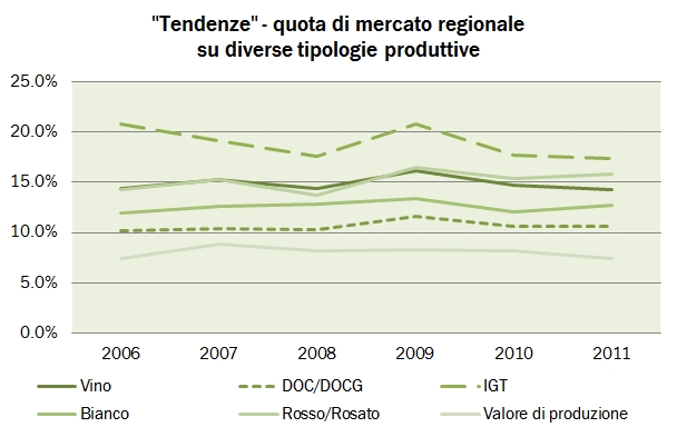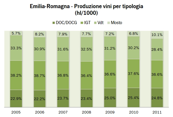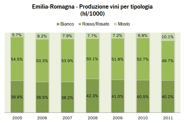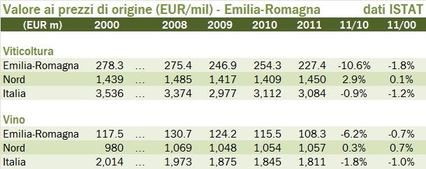 - L’economia del vino della regione sembra andare male. Secondo ISTAT, il valore della produzione ai prezzi di origine scende del 10% nel 2011 (contro -3% per l’Italia), portando così la media decennale a -1.8% annuo contro il -1.2% dell’Italia ma soprattutto il dato (nominalmente) stabile del nord Italia. Il dato è confermato anche dal valore della produzione di vino, in discesa del 6% a 108 milioni di euro. Anche qui, il calo annuo sul lungo termine dello 0.7% mette la regione Emilia in posizione di svantaggio rispetto alle altre regioni del nord Italia.