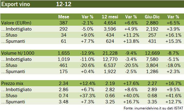 Come anticipavamo sopra, i valori sono in crescita, con un export trainato dal +14% dei vini spumanti a 624 milioni, un +11% dei vini sfusi (nonostante il crollo dei volumi!) a 434 milioni e i 3.6 miliardi di euro dei vini fermi imbottigliati, +5%. Questa categoria, come potete capire visti i numeri in gioco è e restera il “pivot” per capire cosa succederà il prossimo anno. A differenza delle altre due categorie, i vini imbottigliati stanno visibilmente rallentando: nella tabella potete apprezzare come a fronte di un +4.9% annuo, il secondo semestre è andato peggio, a -3.9% e il mese di dicembre ha segnato addirittura un calo del 5%.