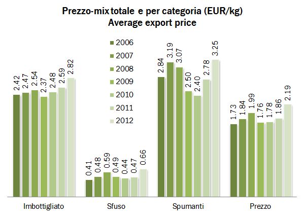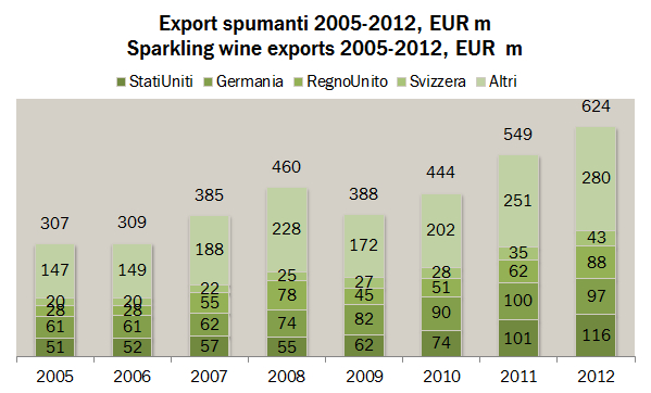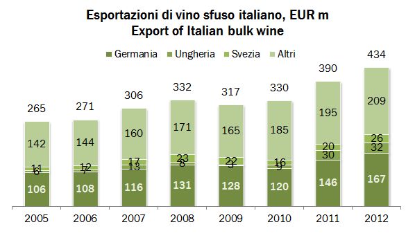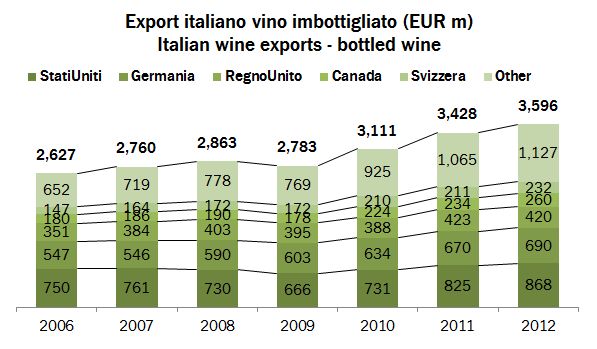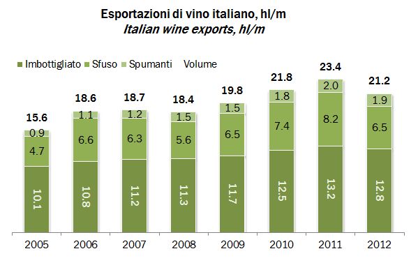 Dopo questo quadro generale torniamo ai numeri. Nel 2012 dei 21.2 milioni di ettolitri esportati, di cui 12.8 milioni di vino imbottigliato, il 3.4% in meno del 2011, 6.5 milioni di vino sfuso, -20% e 1.9 milioni di vini spumanti, anch’essi -2%.