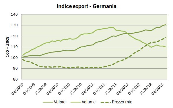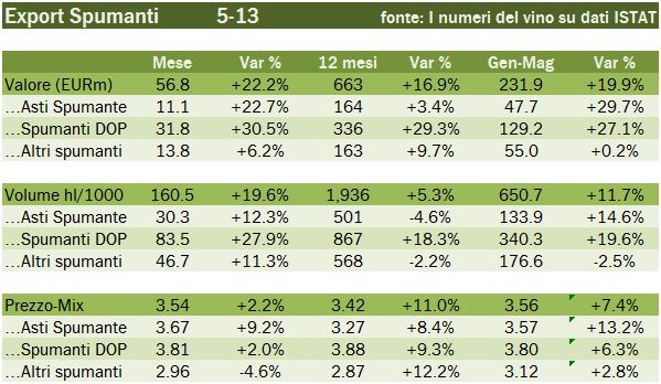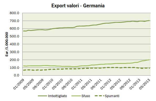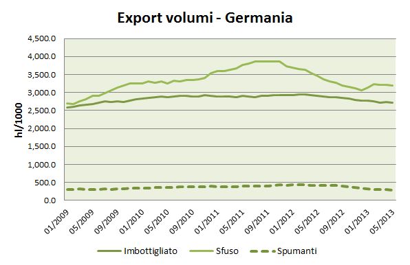 - I volumi continuano a scendere. In maggio il calo è del 5% a 1.8 milioni di ettolitri, il che significa 8.2 milioni esportati da inizio anno e un totale di circa 20.8 milioni sui 12 mesi. Nei primi 5 mesi dell’anno si sono persi circa 300mila ettolitri rispetto al fine anno 2012.