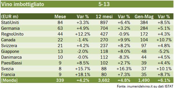 - Nei vini imbottigliati si sta stabilizzando il Regno Unito, che aveva subito qualche calo nei mesi scorsi, mentre sia USA che Germania crescono del 3-5% nel mese. Il saldo di maggio è un +4% dei valori a fronte di un -6% nei volumi, un valore più accentuato di quelli visti nei mesi precedenti.