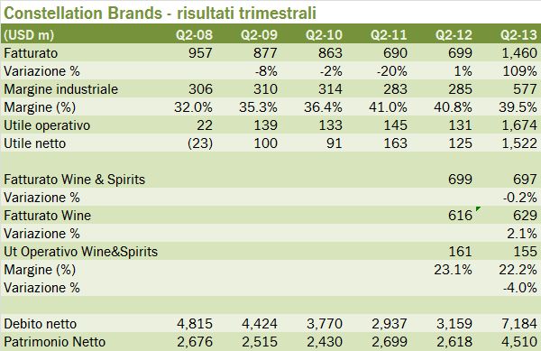 Constellation Brands ha cominciato con il secondo trimestre 2013 la sua “nuova vita”, avendo chiuso a inizio trimestre l’acqiusizione di Crown imports. La struttura dei conti è pesantemente cambiata e oggi, a guardare il gruppo, si può ben dire che la birra conti più del vino: nel trimestre il vino ha generato 155 milioni di utile operativo, mentre la birra ne ha fatti circa 220, il tutto prima dei costi corporate e degli aggiustamenti (che sono stati molto significativi). Il bilancio di cui vedete i principali numeri in tabella subisce poi uno stravolgimento dovuto alla rivalutazione delle attività di Crown per circa 1.6 miliardi di dollari (che vedete sull’utile operativo totale), mentre il debito sale a 7.2 miliardi di dollari, dai precedenti 3.5 dopo il deal. Per i nostri scopi di analisi le cose non vanno così male, dato che il segmento vino è oggetto, con gli spirits, di un segmento a parte. Il trimestre, come vedremo nel resto del post non è andato tanto bene, anche se più che del vino si tratta di un problema degli spirits. Buona Lettura.