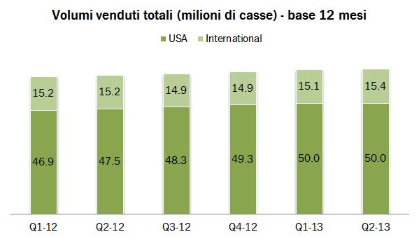 - I volumi sono stati 16.6 milioni di casse, circa il 2% in più dello scorso anno, il che implica un impatto negativo in termini di price mix (già visto lo scorso trimestre) di circa 2-3 punti percentuali. Il management ha chiarito che le iniziative promozionali si concentreranno nel secondo semestre, quando però, notiamo noi, la base di comparazione sarà particolarmente più difficile. Su base annua, includendo acquisizioni, i volumi salgono del 4.3%, di cui +5.3% in USA e +1.3% nel resto del mondo.