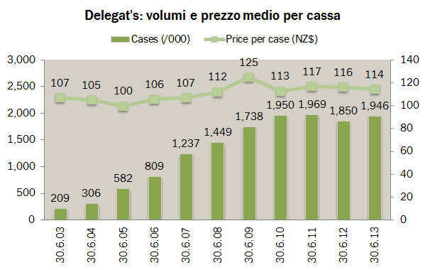 - Le vendite sono state di 222 milioni di dollari neozelandesi, +3%, realizzati a fronte di un incremento del 5% dei volumi a 1.95 milioni di casse e di una riduzione del prezzo per cassa del 2% a 114 dollari locali.