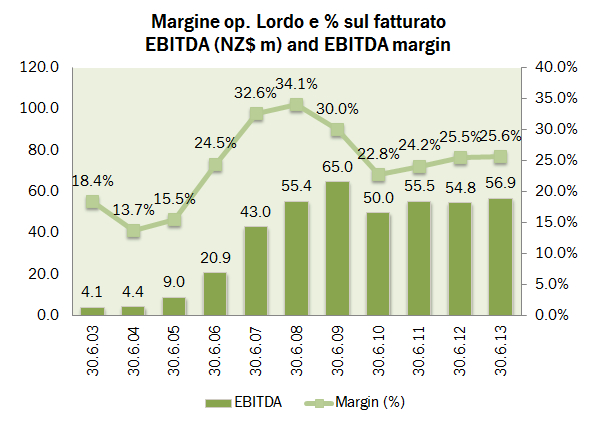 Dopo diversi anni passati a ristabilizzare la struttura finanziaria e a portare l’azienda a un buon livello di redditività, nel corso del 2012-13 Delegat’s ha ripreso il sentiero della crescita investendo 73 milioni di dollari locali nell’acquisizione di nuove tenute, parte in Nuova Zelanda e parte in Australia. Il risultato è un incremento del debito del 47% circa, che si confronta con dei risultati reddituali (2012-13) non troppo soddisfacenti, in parte a causa della vendemmia scarsa ma soprattutto a causa del forte apprezzamento della valuta locale. Il marchio Oyster Bay continua a crescere penetrando negli USA. L’andamento borsistico premia la strategia: il valore delle azioni ha raggiunto 384 milioni di dollari locali, con un multiplo di 9 volte il MOL (storico) e 11.6 volte l’utile operativo. Vediamo insieme i numeri.