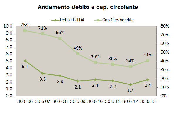 - Il debito sale quindi a 135 milioni rispetto ai 92 dello scorso anno, scontando anche 9 milioni distribuiti come dividendo ai soci. Il rapporto debito/MOL sale da un tranquillissimo 1.7 volte a 2.4 volte, ancora piuttosto basso considerando che gli attivi tangibile del gruppo sono quasi 300 milioni, quindi oltre 2 volte tanto.