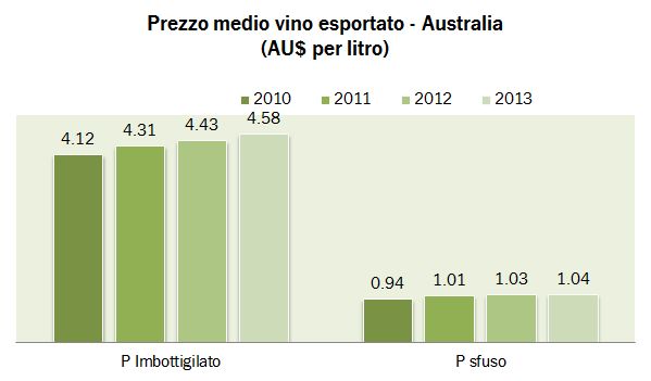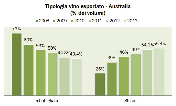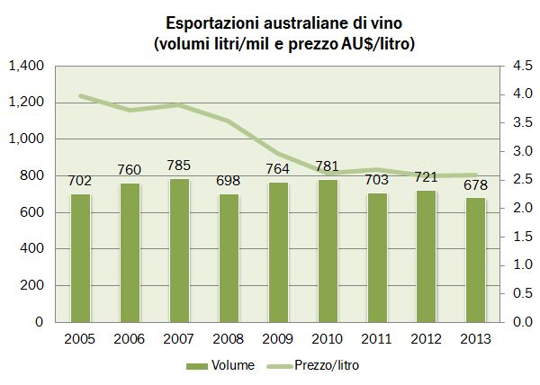 - L’Australia ha esportato nel 2013 6.8 milioni di ettolitri di vino, con un calo del 6% rispetto al 2012 e una riduzione in valore assoluto di circa 0.4 milioni di ettolitri.