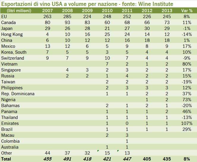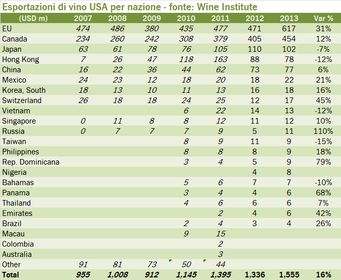 Analizziamo oggi le esportazioni di vino dagli USA, come riportate dal Wine Institute su dati della dogana americana. Notate che c’è una riclassificazione rispetto al passato che non rende i dati pienamente confrontabili con quelli degli scorsi anni; in particolare, viene riclassificato il dato di esportazione per togliere il vino che è stato a sua volta riesportato in altri mercati. Questo determina una rettifica al ribasso dei numeri, che è particolarmente evidente in alcuni mercati a forte caratterizzazione di ri-export (Hong Kong, per esempio, piuttosto che il Messico nel caso degli USA). Per questo motivo, ci focalizziamo soprattutto sul confronto 2012-2013, perché confronti di lungo termine non sono più possibili. Passiamo ai dati.