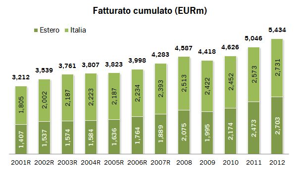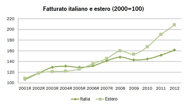- Le 111 aziende del campione hanno realizzato 5.4 miliardi di euro di vendite, in crescita del 7.7%, con un incremento del 6% in Italia e del 9% all’estero. Nel 2013, secondo le indicazioni preliminari, tale incremento sarà del 5%, quindi con vendite vicine a 5.7 miliardi di euro, sempre spinte dall’export, in crescita dell’8% e con vendite italiane nell’intorno del +2%.