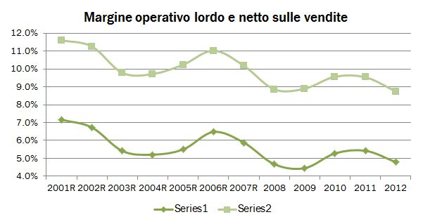Detto in altri termini: dietro a tutti questi articoli trionfali sul vino italiano, sul suo successo all’estero, sulla crescita delle esportazioni e via dicendo si cela una dura verità: nel 2012 a fronte di un incremento delle vendite aggregate di queste 111 aziende dell’8% (bel numero), il valore aggiunto è rimasto fermo, il MOL è sceso dell’1%, l’utile operativo del 5% e l’utile netto ha fatto -2%. L’indebitamento cumulato del settore è cresciuto del 6% contro il +4% del patrimonio degli azionisti. Tradotto: i risultati sono stati pessimi. E’ questione di un anno? No, purtroppo. Su 10 anni 2002-2012, le vendite crescono del 4.4% annuo, il MOL soltanto del 2% e l’utile operativo e quello netto dell’1%. E’ colpa delle cooperative? Nemmeno. Se restringiamo i dati alle aziende, come vedremo tra qualche giorno troviamo delle conclusioni molto simili. Il mondo del vino italiano non riesce a tradurre in profitti i successi commerciali che ottiene nel mondo. C’è un mercato locale che non aiuta? Certamente. C’è però un problema più importante. Le aziende sono troppo piccole rispetto alla dimensione del mercato e alla competizione di altri paesi produttori. Gli investimenti degli ultimi anni forse sono stati sbagliati, dato che nel 2000 il ritorno sul capitale sfiorava il 10% e oggi sta al 7%. Al di là degli appelli di “fare sistema” lanciati da una persona a me molto cara (alla quale dico sempre che in Italia ci vorrebbero una decina di imprenditori come lui nel mondo del vino italiano), è necessario costruire aziende più grandi e profittevoli. Forse anche per questo, Mediobanca da anni scrive questo rapporto: un giorno o l’altro dopo tanti soldi spesi per farlo verrà il momento di incassare con qualche commissione su operazioni di M&A o, chissà, quotazione in borsa. E adesso passiamo ai numeri con l’avvertenza che qui dentro ci sono tante cooperative, quindi i dati sui margini sono un po’ sballati…