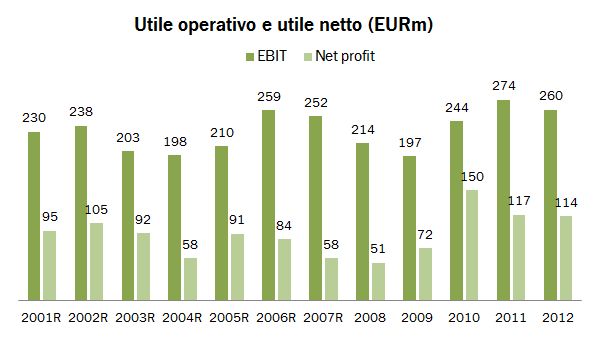 - Come dicevamo i margini sono scesi. Il costo degli acquisti esterni sale dall’80.8% all’82.1%, determinando un valore aggiunto stabile a 973 milioni, il costo del personale sale del 2% (occupati +1.5%), spingendo il MOL giù del 2% a 475 milioni. Il margine MOL/vendite scende dal 9.5% all’8.7%, il minimo storico dal 2000 a questa parte. Gli ammortamenti salgono del 3.6%, gli oneri finanziari netti del 26% (leggi aumento degli spread sul debito italiano), quindi l’utile pretasse scende del 14%. Un calo delle imposte del 7% e la presenza di proventi non ricorrente fa richiudere il gap sull’utile netto a un calo soltanto del 2%.