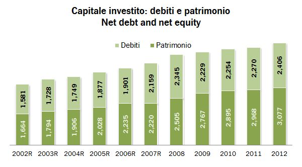 - Gli investimenti del settore riprendono la corsa a oltre 300 milioni di euro, cioè un rapporto di 1.5 sugli ammortamenti, il che significa espansione delle base di attività, ma già il rapporto segnala per il 2013 un calo del 25% che dovrebbe riportare il rapporto poco sopra 1x (cioè normale mantenimento della base).