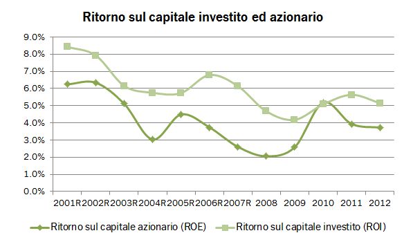 - Infine, il ritorno sul capitale, che visti questi numeri (denominatore che sale e numeratore che scende) non possono essere buoni. Il ritorno sul capitale scende al 5% (abbiamo visto di peggio, ma solo nel 2009) e il ritorno per gli azionisti dopo le tasse è al 4%. Troppo poco.