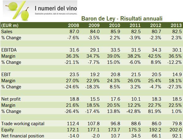 Ritorniamo dopo un paio di anni su Baron de Ley, una delle aziende leader del vino in Spagna focalizzata sulla più grande e rinomata zona vinicola, la Rioja. Leggere il bilancio di Baron de Ley è piuttosto difficile, in primo luogo perchè i termini finanziari in spagnolo sono difficili, e in secondo luogo perchè l’azienda ha una logica talvolta un po’ speciale. Dal riacquisto delle azioni degli anni scorsi (continuato anche nel 2013 per 10 milioni di euro), al forte profilo di generazione di cassa che si combina con risultati non così eclatanti. Il 2013 è stato di nuovo un anno difficile, come molti di quelli recenti a causa della crisi del mercato interno. Le vendite non sono più scese come in passato mentre i margini sono scesi al livello più basso degli ultimi anni, complici un mix di fatturato meno positivo e, presumibilmente, lo spostamento di fatturato verso aree meno profittevoli. Il mercato per Baron de Ley sta un po’ cambiando, soprattutto in Spagna, dove la domanda si sta spostando verso i vini bianchi: per questo l’azienda ha piantato 48 ettari di vigneti a Chardonnay, Verdejo e Sauvignon Blanc, portando il totale a 887 ettari. Leggiamo insieme i dati del bilancio dunque.