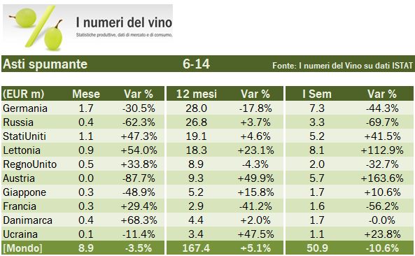 - Passiamo brevemente alle categorie. L’Asti spumante e’ decisamente la categoria piu’ preoccupante, dato che i numeri si sostengono su incredibili cambiamenti di mix tra i mercati. Nel semestre, il primo mercato e’ addirittura diventato la Lettonia, con 8 milioni di euro. E’ vero che i dati semestrali sono ballerini, ma certamente fa specie trovarsi di fronte al calo del 45% in Germania, del 70% in Russia e del 33% nel Regno Unito. Se sul semestre le vendite calano del 10%, nell’anno siamo ancora di fronte a un +10%, che pero’ ricordo bene fu generato dal recupero delle esportazioni verso la Russia, che difficilmente saranno confermate quest’anno.