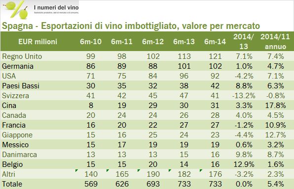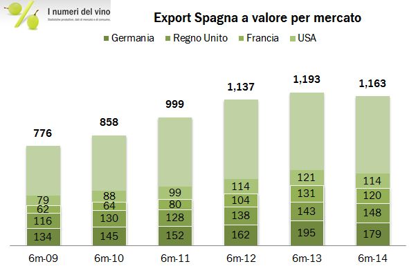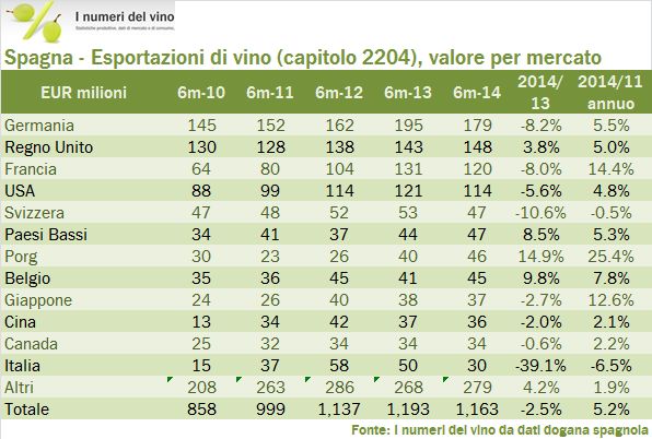 Spagna – esportazioni di vino, primo semestre 2014