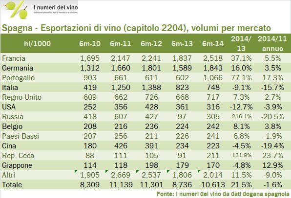 • Ma dove sono andati questi 2 milioni di ettolitri di vino che la Spagna ha “aggiunto” nel semestre. Si direbbe in Francia, Germania e Portogallo. Questi tre mercati sono passati da 4 milioni di ettolitri di importazioni di vino spagnolo a 5.4 milioni. La Francia va poi menzionata perchè da sola assorbe ben 2.5 milioni di ettolitri di vino spagnolo tra gennaio e giugno 2014.