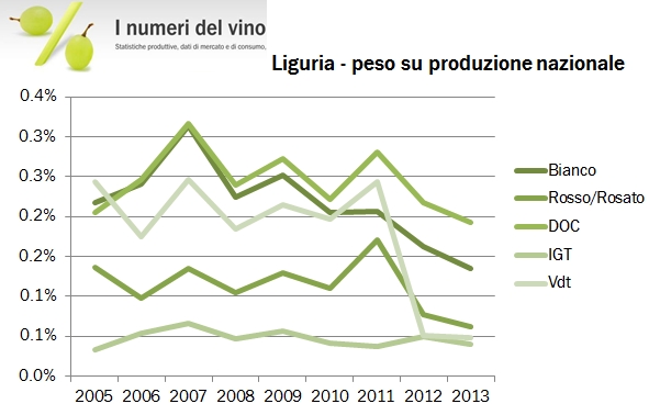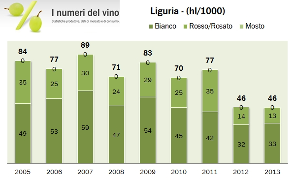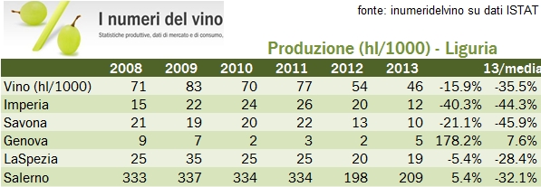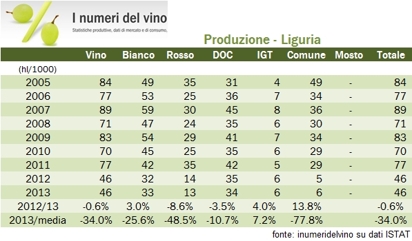 - Secondo ISTAT la produzione 2013 di vino in Liguria è stata di 46mila ettolitri, praticamente la stessa del 2012, che aveva visto un crollo drammatico dei volumi. Siamo dunque circa il 34% sotto la media storica prodotta in regione.