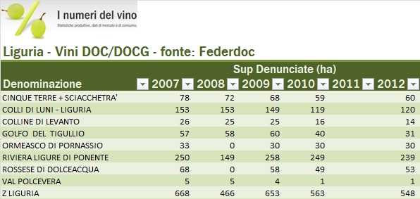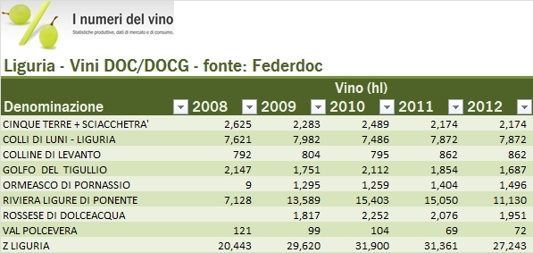 - Infine, un occhio alla produzione DOC del 2012 per denominazione. Intanto vi segnalo che sono riprese le serie statistiche sulle superfici denunciate. Annata medio cattiva il 2012 secondo Federdoc per la maggiore DOC, Riviera Ligure di Ponente da 15mila a 11mila ettolitri, su produzione stabili intorno a 8mila ettolitri la DOC Colli di Luni, non sembra invece riprendersi la produzione della DOC certamente più tipica e singolare della regione lo Sciacchetrà che veleggia intorno ai 2200 ettolitri.