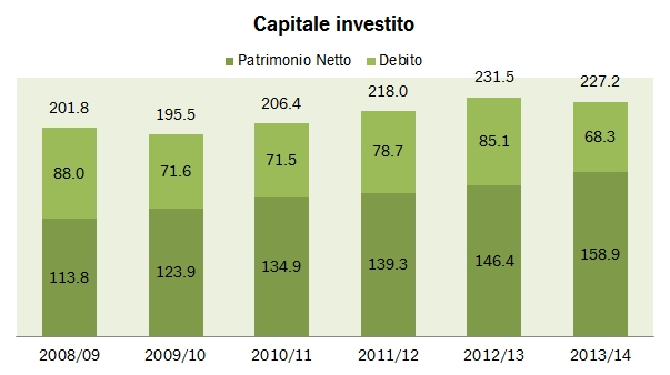 - La struttura finanziaria migliora ulteriormente, con un debito netto di 68 milioni, contro 85 milioni del 2012/13. A contribuire al calo del debito, oltre alla generazione di cassa di 22 milioni (da 21 del 2012-13), un miglioramento del capitale circolante di 6 milioni di euro, contro l’assorbimento di 14 dell’anno precedente e investimenti di 7.4 milioni, allineati agli ammortamenti.