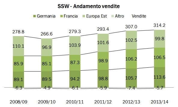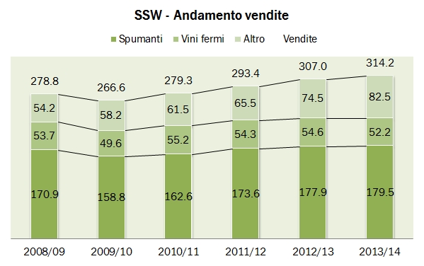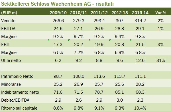 Schloss-Wachenheim ha avuto un ottimo 2013-14, con un leggero incremento delle vendite ma un più deciso aumento degli utili grazie al calo degli oneri finanziari e della tassazione. Come ricorderete il gruppo è esposto in proporzioni molto simili al mercato tedesco, francese e a quello dell’Est Europa, con una presenza nel segmento dei vini spumanti ma anche nella nicchia a forte crescita dei vini non alcolici. Andiamo insieme a vedere l’andamento dei principali mercati e i risultati 2013-14.