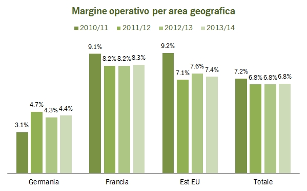 - In Francia, la dinamica dei volumi è la medesima (-7% a 73m di bottiglie), ma le vendite in questo caso non crescono a causa della più difficile situazione economica. In Est Europa le cose invece vanno peggio. Le vendite calano del 3%, compreso un effetto valutario di poco più dell’1% e volumi giù del 2% a 60 milioni di bottiglie.