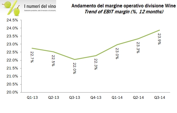 Dopo il passo falso del secondo trimestre dovuto all’annuncio di nuovi invstimenti, Constellation Brands ha recuperato il terreno perso nel trimestre terminato a ottobre, il più importante dell’anno in ottica stagionale. L’attività è andata bene su tutti i fronti, con un incremento degli utili su base comparabile superiore al 10%, che è un dato importante soprattutto considerando che questo trimestre era il primo che “includeva” la birra Corona anche nella base di comparazione dell’anno scorso. Il management ha dunque aumentato le stime di utile per azione del 3% (dopo un analogo rialzo effettuato a agosto, che porta la stima a essere il 6% più alta delle previsoni originarie fatte a aprile 2014). E il vino? Beh, il segmento vino non si è mosso bene come quello della birra. I margini continuano a crescere (come vedete dal grafico siamo al 24% a livello operativo negli ultimi 12 mesi), ma le vendite quest’anno fanno più fatica. Nel terzo trimestre le “depletions” cioè le vendite al dettaglio dei marchi di Constellation Brands sono state stabili, dopo un incremento del 2.4% nel secondo trimestre e un calo dell’1.8% nel primo trimestre, anche a causa di una base di comparazione piuttosto difficile. Andiamo ad analizzare tutti i numeri insieme